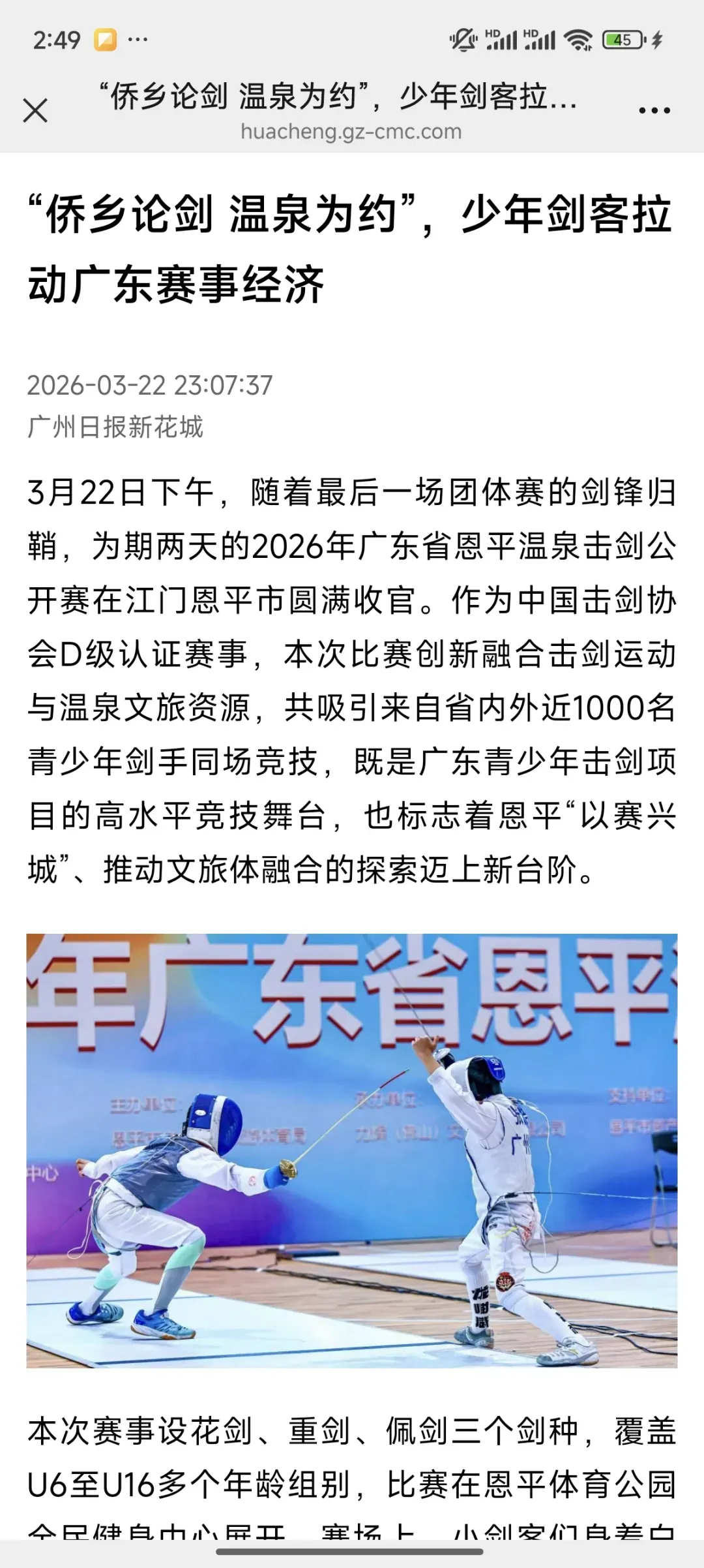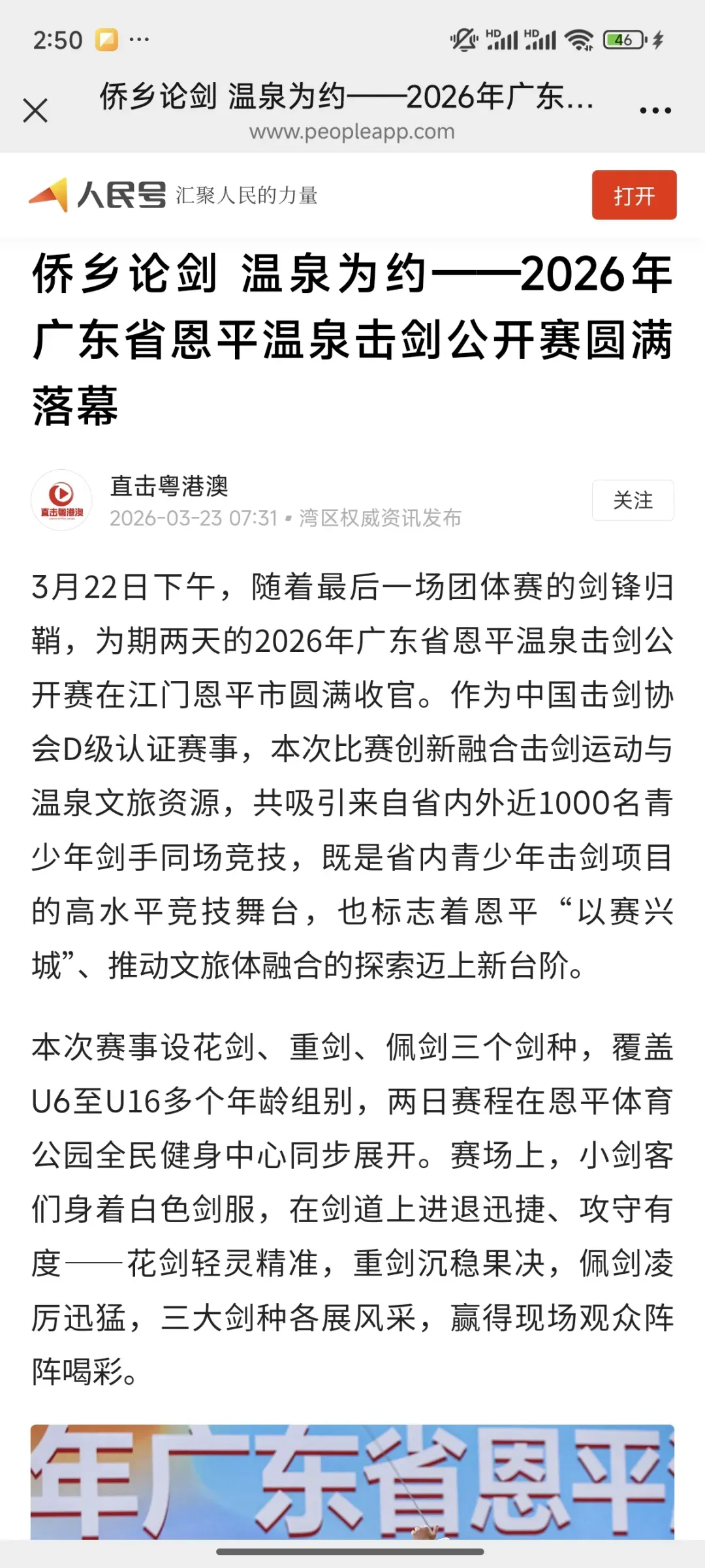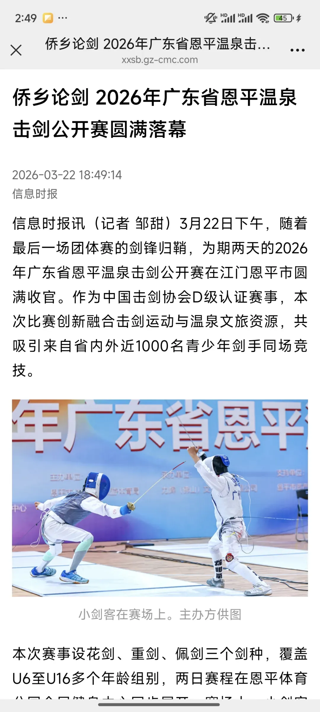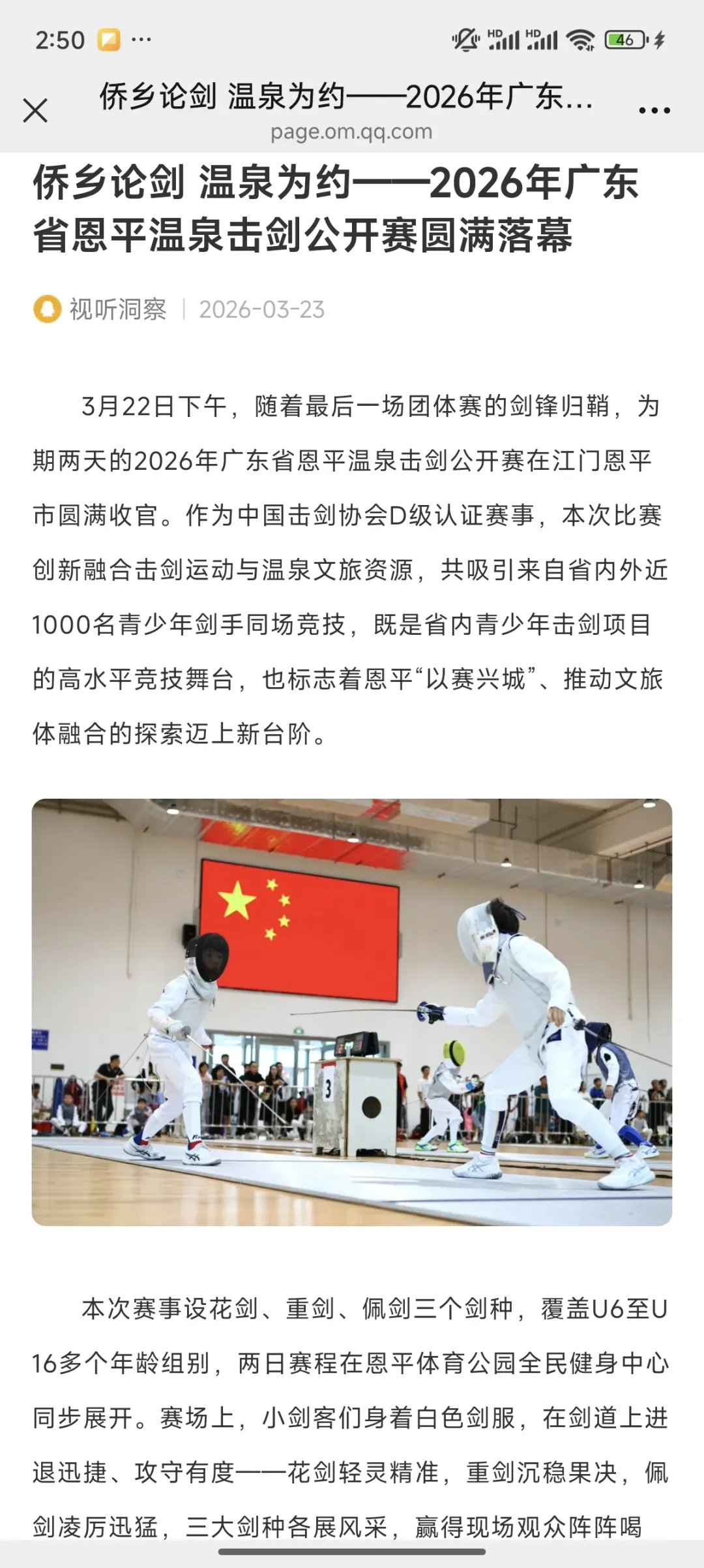 3月22日,2026年广东省恩平温泉击剑公开赛在江门恩平市圆满落幕。作为中国击剑协会D级认证赛事,本次比赛创新融合击剑竞技与温泉文旅特色,吸引省内外近千名青少年剑手同场竞技,获多家主流媒体平台全方位报道,热度持续攀升!