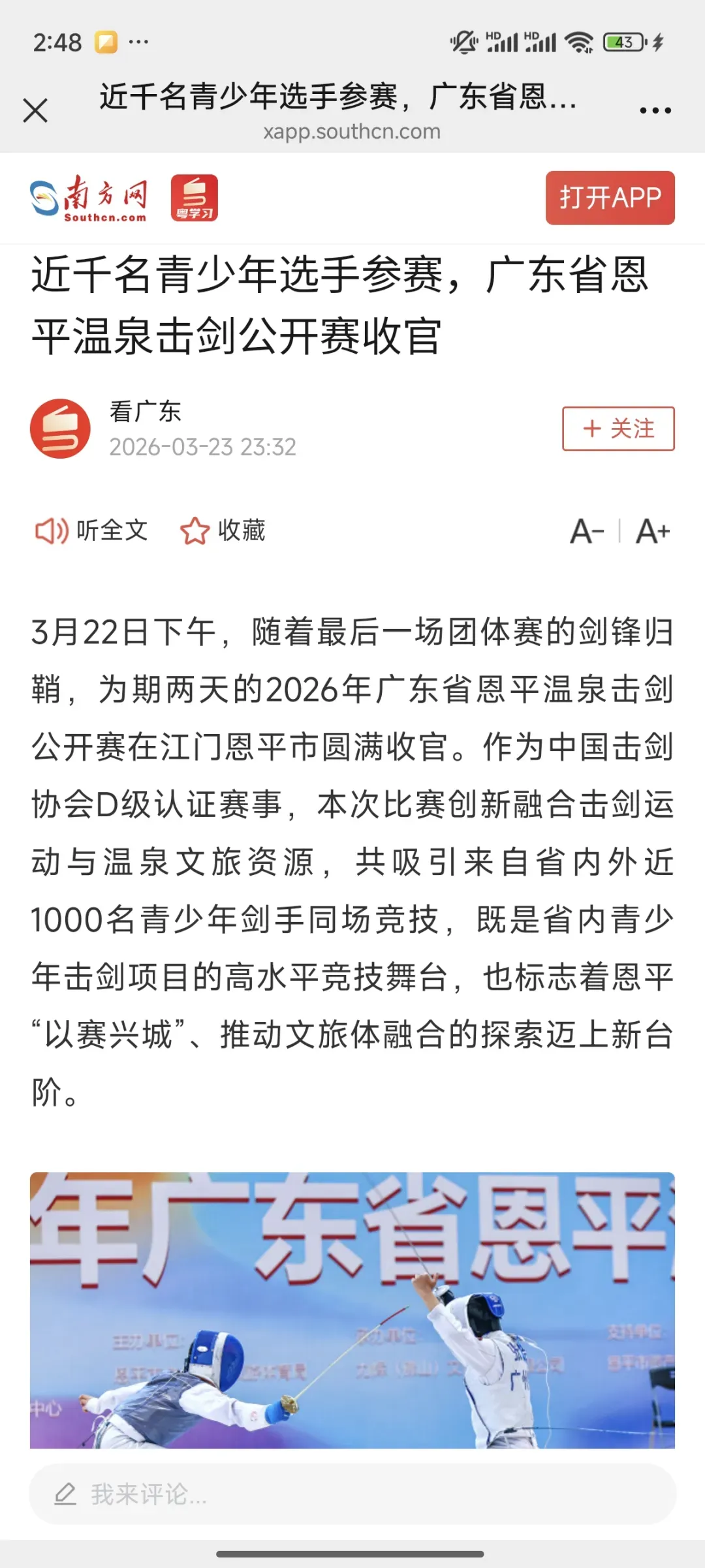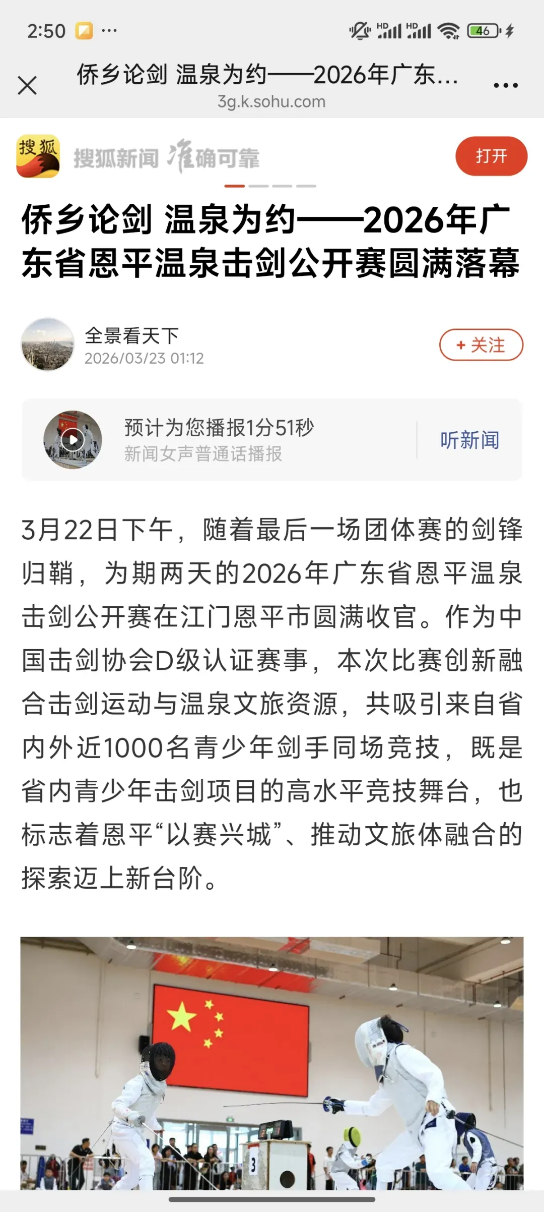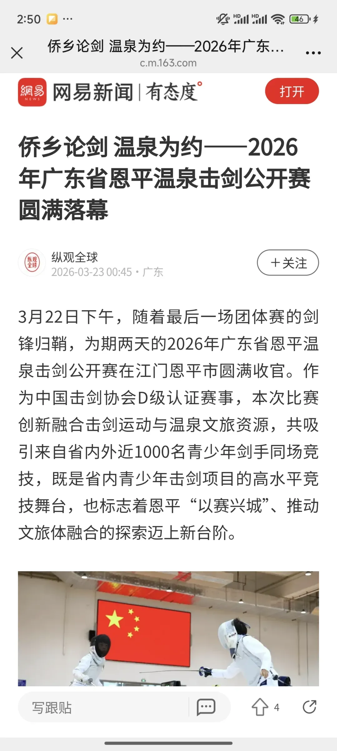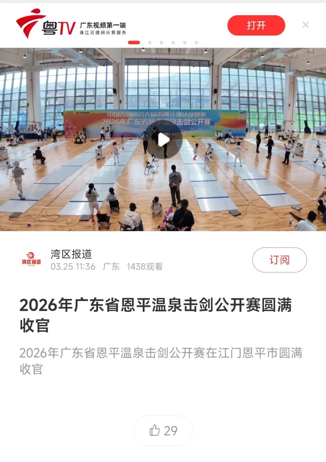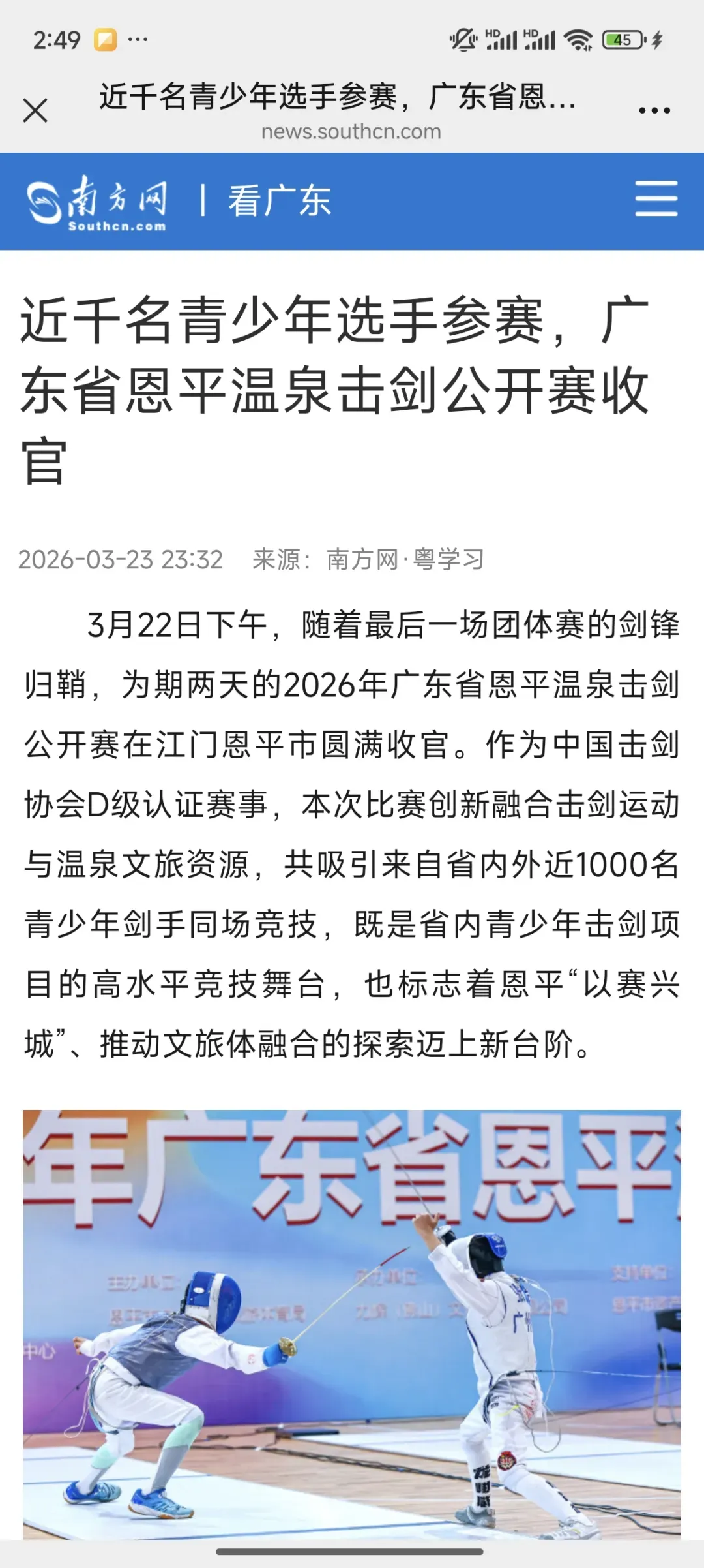 3月22日,2026年广东省恩平温泉击剑公开赛在江门恩平市圆满落幕。作为中国击剑协会D级认证赛事,本次比赛创新融合击剑竞技与温泉文旅特色,吸引省内外近千名青少年剑手同场竞技,获多家主流媒体平台全方位报道,热度持续攀升!